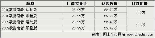 據(jù)4S店銷售人員介紹:指南者目前共有2009款及2010款車型,分別為運動版及限量版總共4款。09款車型現(xiàn)車顏色為黑色及綠色,全系優(yōu)惠1.5萬元;2010款車型有黑色、綠色、紅色,最高優(yōu)惠1.2萬元。目前老款及新款優(yōu)惠價格相對較高,如果到店洽談會有簡單裝飾贈送。09款指南者優(yōu)惠后最低僅售22.49萬元,凸顯性價比。