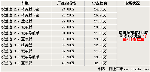 據(jù)廣汽豐田4S店銷售人員介紹,國產(chǎn)漢蘭達自上市以來持續(xù)熱銷,目前漢蘭達現(xiàn)貨非常緊張,如果消費者急于提現(xiàn)車的話,需要在店內(nèi)加裝2萬元的汽車裝飾或加價1萬元現(xiàn)金。如預(yù)訂則需要到今年6月份才能提到車,訂金為1萬元。北京地區(qū)各4S店由于訂單不同,各店銷售的現(xiàn)車顏色有所不同。