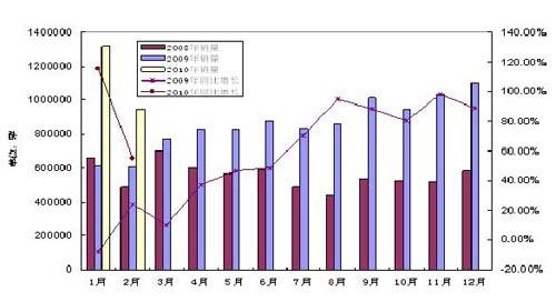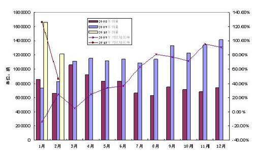 2月,轎車產(chǎn)銷分別為61.83萬(wàn)輛和62.31萬(wàn)輛,分別比同期增長(zhǎng)48.17%和45.88%。1-2月,轎車的產(chǎn)銷分別為148.14萬(wàn)輛和155.33萬(wàn)輛,分別比同期增長(zhǎng)88.52%和79.31%。其中,自主品牌轎車?yán)塾?jì)銷售52.51萬(wàn)輛,占轎車銷售總量的33.81%,比2009年所占比例提升了4.14個(gè)百分點(diǎn)。