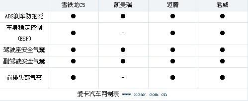 車型的安全性配置是購(gòu)買者非常關(guān)注的一個(gè)因素,我們?yōu)榇蠹疫x取了五種較為常見的主被動(dòng)安全配置進(jìn)行比較。