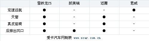總的來(lái)看C5的配置單還是比較有誠(chéng)意的,基本能做到“人無(wú)我有”。比較尷尬的是凱美瑞,作為一款2.4L,價(jià)格在20萬(wàn)左右的中級(jí)車型,標(biāo)配里不含真皮座椅,也許會(huì)讓一部分消費(fèi)者望而卻步。