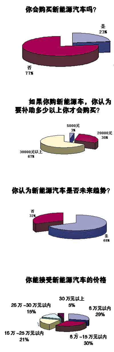 就新能源汽車目前的現(xiàn)狀,記者向近100位讀者做了調查,很多消費者在接受調查時表示,新能源車的技術還不成熟,但是目前的新能源車價格卻很高,對于普通的消費者來說,還不如買一部普通的用油小車。