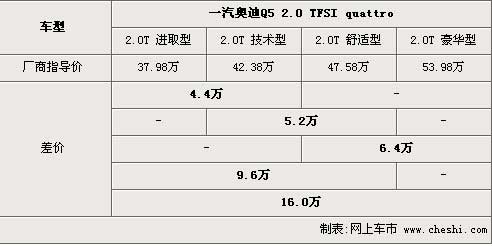 國產版奧迪Q5分為2.0T進取型、2.0T技術型、2.0T舒適型以及2.0T豪華型4款車型,售價區(qū)間為37.98-53.98萬元。如上圖所示,4款車型中的最低差價為4.4萬元,而最高差價則高達16萬元。