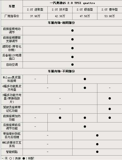 在內(nèi)部配置上,奧迪Q5前排的駕駛員以及副駕駛提供了帶有腰部支撐功能的電動可調(diào)節(jié)座椅,除了進取型外,其他3款前排座椅均帶有加熱功能,且豪華版車型的前排座椅還配有電動記憶功能。入門級的進取型采用的是Havanna織物面料座椅,而其他3款車型均采用了Milano真皮包裹的座椅。進取型以及技術(shù)型采用了4輻真皮方向盤,舒適型的4輻方向盤帶有多功能鍵,為了增添駕駛樂趣,豪華版車型在3輻多功能真皮方向盤的后方配有換擋撥片。值得一提的是,技術(shù)型、舒適型以及豪華型的后排座椅可以前后調(diào)節(jié)100mm,為體型稍胖的乘客提供了更大的腿部空間。