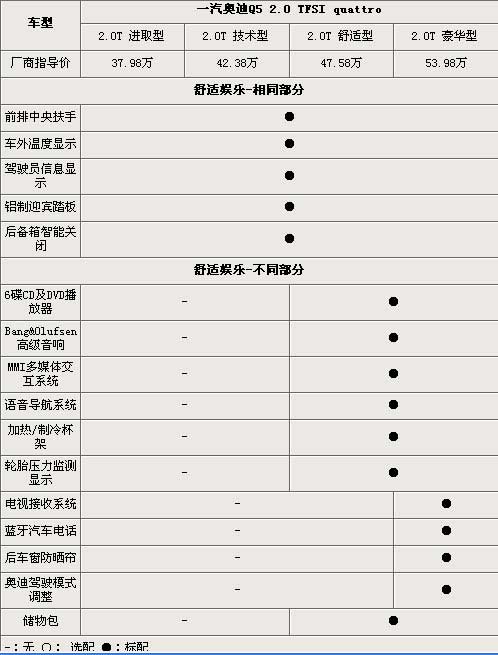 往往全系車輛的價格差異差的最多的就是在豪華娛樂配飾上面,奧迪Q5當然也不例外。奧迪Q5舒適型以及豪華型配備了奧迪的第三代MMI多媒體交互系統(tǒng),通過精簡控制器,MMI可以迅速、方便、直觀地使用大量的功能和技術。播放器選用了帶有DVD功能的6碟CD系統(tǒng),而音響也是選用了丹麥的頂級音響品牌Bang&Olufsen,綜上幾個配置,都是在進取型以及技術型上看不到的配置。頂配的豪華版車型,相比其他3款車型則多了電視接收系統(tǒng)、藍牙汽車電話等高科技味道十足的娛樂設備,而可以調節(jié)減震阻尼軟硬的奧迪駕駛模式系統(tǒng),也是只在頂配的豪華版車型上共享的。