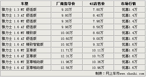 雅力士是一款在國內(nèi)非常受歡迎的A0級小車,從這款車的配置、安全性方面,都是一款值得購買的小車。根據(jù)網(wǎng)上車市價格監(jiān)測系統(tǒng)顯示,近期雅力士最高優(yōu)惠1.6萬元,目前有部分型號的現(xiàn)車供應(yīng)。具體車型行情如下: