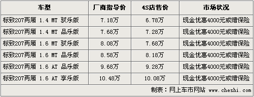 標(biāo)致207系列在推出限量版車型后,一直備受消費(fèi)者關(guān)注。兩廂207在繼承了三廂車型優(yōu)點(diǎn)的同時(shí),又添加了許多運(yùn)動(dòng)因素,更適合年輕時(shí)尚的消費(fèi)者。根據(jù)網(wǎng)上車市價(jià)格監(jiān)測(cè)系統(tǒng)顯示,目前207兩廂可以優(yōu)惠現(xiàn)金4000元,或選擇贈(zèng)送4項(xiàng)保險(xiǎn)及大禮包。具體車型行情如下: