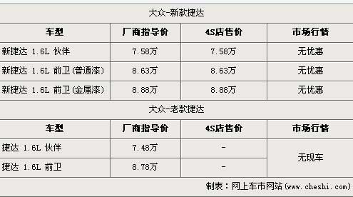 據(jù)北京一汽大眾經(jīng)銷店銷售人員介紹,大眾全新捷達(dá)1.6L分為伙伴版以及前衛(wèi)版兩種車型,售價(jià)分別為7.58萬元和8.88萬元,由于前衛(wèi)版白色車型采用的是普通漆油料,所以在廠商指導(dǎo)價(jià)方面會(huì)比前衛(wèi)版其他顏色車型便宜2500元,售價(jià)為8.63萬元。銷售人員還介紹,老款的大眾捷達(dá)已經(jīng)沒有現(xiàn)車,消費(fèi)者已經(jīng)無法購買到。