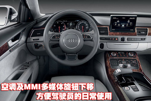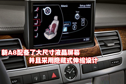 奧迪新A8配備了大尺寸液晶屏幕,并且采用隱藏式伸縮設(shè)計。除通過座椅上的按鈕調(diào)節(jié)座椅外,還可以通過液晶屏幕上的相關(guān)圖示進(jìn)行坐姿選擇。除此之外,中控臺上的復(fù)古式指針石英表也凸顯了奧迪新A8的華貴。