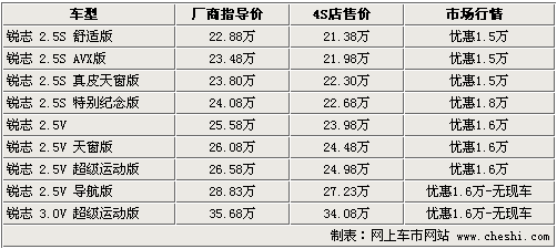 豐田銳志作為一款以運(yùn)動(dòng)著稱的后驅(qū)中級(jí)車,在性能以及操控各方面表現(xiàn)都令人滿意,尤其是獨(dú)具個(gè)性的改裝潛力,讓很多癡迷運(yùn)動(dòng)的車迷們找到了充分的駕 駛樂趣。銳志配備有2.5L和3.0L兩種排量的發(fā)動(dòng)機(jī),同時(shí)超長(zhǎng)的軸距設(shè)計(jì)讓乘員的空間也有了非常理想的狀態(tài)。近日根據(jù)網(wǎng)上車市價(jià)格監(jiān)測(cè)系統(tǒng)顯示,目前 購(gòu)買銳志車型,最高可享受到1.8萬元的現(xiàn)金優(yōu)惠。具體車型見下表: