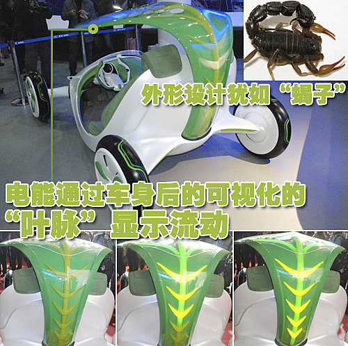 概念車“葉子”在設(shè)計(jì)中以電能為主要?jiǎng)恿碓矗浼夹g(shù)核心是自然能源轉(zhuǎn)換技術(shù),包括光電轉(zhuǎn)換技術(shù),風(fēng)電轉(zhuǎn)換技術(shù)、二氧化碳吸附和轉(zhuǎn)換技術(shù)。將把能源消耗和能源制造有機(jī)結(jié)合在一起,徹底告別了傳統(tǒng)燃料。
