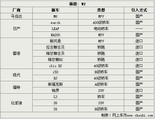 在W2館中,共有7家汽車廠商在此參展,其中福特將帶來國產(chǎn)新福克斯和SUV車型銳界;馬自達(dá)將帶來即將國產(chǎn)的MPV車型——馬自達(dá)8,而現(xiàn)代的兩款全新轎車——i50和RC也將于國內(nèi)消費(fèi)者見面,其中A0級新車RC是北京現(xiàn)代自主研發(fā)車型。日產(chǎn)將在本屆車展帶來新款微車,據(jù)悉這款車型將在9月正式上市。當(dāng)然還有將發(fā)布多款新車的雷諾品牌,新風(fēng)景在北京車展上亞洲首發(fā)。自主新軍比亞迪汽車,將發(fā)布L3、I6、S6等新車型。