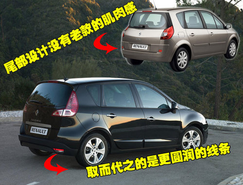 雷諾新風(fēng)景的前臉設(shè)計來自梅甘娜coupe設(shè)計風(fēng)格。原本富有攻擊性的跑車化設(shè)計“轉(zhuǎn)載”到MPV車型后,變得溫和許多,更多地體現(xiàn)一種時尚感 覺。三段式保險杠再配合兩端進氣口的白色裝飾,形成一條優(yōu)美的曲線,不僅使前臉更富線條感,而且更像是一副笑臉;而氣口附近的霧燈十分精致,內(nèi)鑲嵌式設(shè)計 使其猶如笑臉中的酒窩。