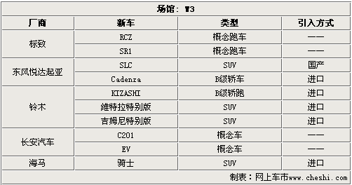 在W3館中,共有7家汽車廠商在此參展,除雪鐵龍/東風(fēng)雪鐵龍和開瑞外,其余廠商如標(biāo)致將帶來兩款概念車RCZ和SR1;東風(fēng)悅達(dá)起亞將帶來即將國產(chǎn)的SUV車型——SLC(海外版新獅跑)和以進(jìn)口方式引入的新中級車——Cadenza,鈴木將在本屆車展中帶來三款車型,其中新款轎跑車KAZASHI是最大的亮點。自主品牌也不甘寂寞,長安汽車和海馬汽車分別帶來了C201概念車和SUV車型——騎士。