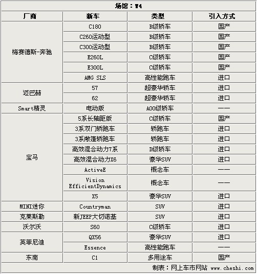 在2010北京國(guó)際車展即將開幕之際,我為您奉上W4場(chǎng)館詳細(xì)參展品牌及車型介紹,希望通過(guò)這篇詳細(xì)介紹,讓您在W4館內(nèi)找到自己喜歡的車型,并度過(guò)愉快的一天。這次共有9大品牌在W4場(chǎng)館內(nèi)進(jìn)行參展,其實(shí)不乏業(yè)界一線品牌,譬如梅賽德斯奔馳集團(tuán)、寶馬集團(tuán)、克萊斯勒集團(tuán)及沃爾沃等知名品牌。作為一線品牌,它們?cè)诹料嘬囆蜕弦策M(jìn)行了仔細(xì)篩選,譬如國(guó)內(nèi)知名度較大的E級(jí)轎車、全新一代5系Li以及JEEP新大切諾基等車型,這些車型的亮相及發(fā)布,定會(huì)引起國(guó)內(nèi)消費(fèi)者的廣泛關(guān)注。