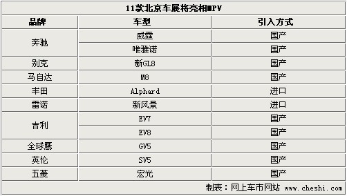 這次在2010北京車展上展出的MPV共有十余款,我們選擇了奔馳、別克、馬自達(dá)、雷諾、豐田、吉利、全球鷹、英倫、五菱共9個(gè)品牌11款車型。在國內(nèi)知名度相對較高的車型有別克GL8,馬自達(dá)8以及五菱宏光。下面將為您奉上這十余款車型的詳細(xì)介紹,希望您能夠喜歡。