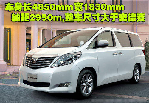 目前日本本土銷售的豐田Alphard是其第二代車型,分為兩驅(qū)和四驅(qū)兩個(gè)版本,兩驅(qū)車型的車身長(zhǎng)4850 mm ,寬1830 mm ,高1890mm,四驅(qū)車型的車身長(zhǎng)為4850 mm ,車寬1830 mm ,高1905mm,而軸距均為2950mm。