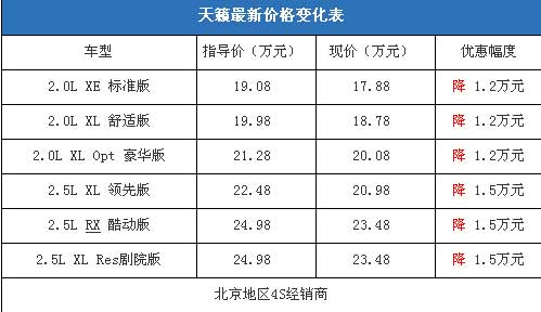 近日我們從東風(fēng)日產(chǎn)北京海潤(rùn)嘉4S經(jīng)銷商處了解到,天籟的現(xiàn)車充足,顏色也比較全,不過(guò)以銀色和黑色為主。如果部分車型需要預(yù)定,等待的時(shí)間為1個(gè)月左右,定金為2000元。目前2.0L排量車型可以優(yōu)惠1.2萬(wàn)元,2.5L排量車型可以優(yōu)惠1.5萬(wàn)元。