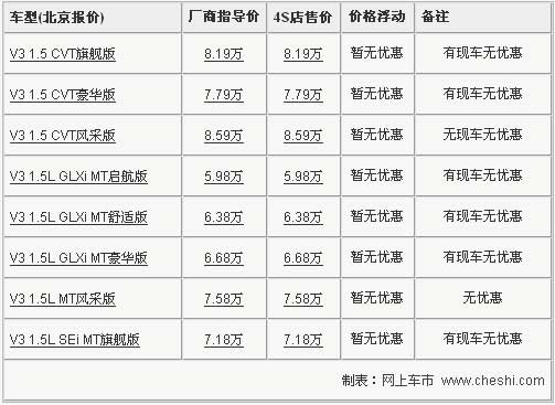 上市時間較長的東南V3菱悅系列,相繼推出了全新的風采版車型及CVT版車型,豐富的產(chǎn)品線也使這款車型的更受消費者關(guān)注。網(wǎng)上車市網(wǎng)站由北京地區(qū)各家經(jīng)銷商處了解到,東南V3菱悅各個車型的現(xiàn)車比較齊全,只有個別顏色需要預(yù)訂。另外,東南V3菱悅CVT車型也已經(jīng)到店,有現(xiàn)車銷售。