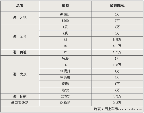 目前來自歐元區(qū)的德系及法系汽車品牌的售價(jià),均有不同程度的提升。由于奔馳、寶馬、奧迪和大眾均為德系品牌,所以部分車型均有大幅讓利。其中大眾輝騰最高優(yōu)惠達(dá)9萬元,而奔馳新E和寶馬X3也分別有6萬和6.5萬的優(yōu)惠。除此之外,雪鐵龍和標(biāo)致等所屬歐元區(qū)的法系汽車品牌也有不同降幅,其中進(jìn)口標(biāo)致207CC最高降幅已達(dá)4.5萬元。