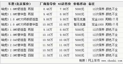 由于瑞虎大師版車型剛剛上市,4S店還沒有現(xiàn)車銷售,消費(fèi)者如果想預(yù)訂此車型需要交納1000元定金,預(yù)計(jì)提車周期在1個(gè)月左右。雖然大師版沒有現(xiàn)車也暫無(wú)優(yōu)惠,但是4S店表示現(xiàn)在購(gòu)買瑞虎3的其他車型,可享受4000元現(xiàn)金優(yōu)惠,還可以贈(zèng)送一些裝飾,目前車型顏色并不齊全,白色均無(wú)現(xiàn)車需要預(yù)定。