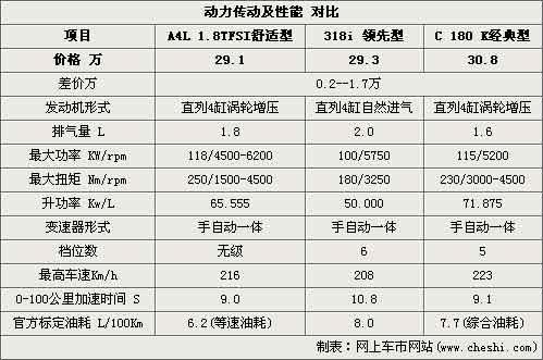 同樣為4缸引擎BMW將318的最大功率限制在了100千瓦和180牛米的扭矩,這與奔馳的1.6升增壓引擎、奧迪的1.8升增壓引擎都無法相比。當然,如果不是對于動力性太過奢求的車主來說,這樣的動力表現已經足夠了。值得關注的是,在單位氣缸工作容積的功率比方面,奔馳C180引擎的1.6升渦輪增壓擁有近72千瓦的升功率表現,確實彰顯了百年汽車品牌在引擎技術上的領先優(yōu)勢。由于引擎動力的不同,三款車型中1.6升排量的奔馳C180在加速性、燃油經濟性上完全可以與另外兩款1.8升或2.0升引擎相抗衡。