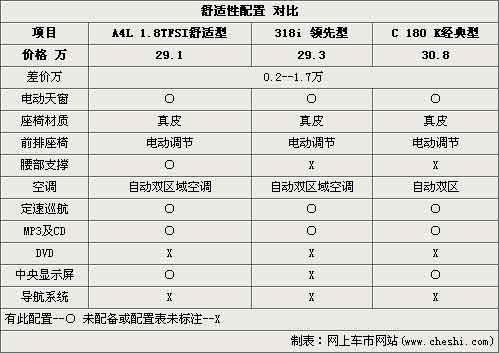 為了讓駕駛變得更輕松讓旅程變得更愜意,高端轎車一般都會具備較為全面的舒適娛樂設(shè)施。這三款車型基本上都是車系的入門產(chǎn)品,因此在配置上豪華型有所欠佳,實用性上也全部沒有配備GPS導(dǎo)航系統(tǒng)和DVD播放功能。不過3款車型均把一觸式防夾車窗、4門一觸式車窗、CD機作為了標(biāo)準(zhǔn)配備,進一步豐富了整車的功能性和娛樂性。其中奧迪A4L還提供了中央顯示屏以及雙區(qū)域的自動恒溫空調(diào),應(yīng)該說是更為細致入微的。
