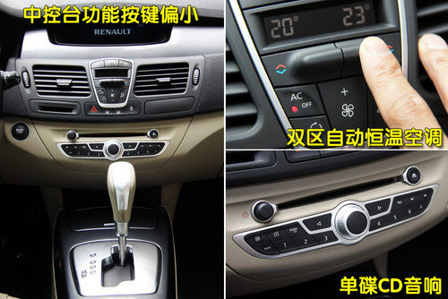 中控臺中細小的按鍵不知道法國人何時能夠為此改變一下,想當(dāng)初進入到C5車內(nèi)時,被琳瑯滿目的小按鍵搞的暈頭轉(zhuǎn)向,并且在駕駛時我是不敢隨意去觸碰那個區(qū)域的。不過還好拉古那中控臺按鍵并不是很多,空調(diào)區(qū)域的造型很時尚,也很節(jié)省空間,實際操作也非常容易上手,調(diào)節(jié)方式也很簡便。另外老款的拉古那配備的是多碟CD,而新款車型裝配的則是單碟CD音響,在日常使用中,多少會有一些不便。