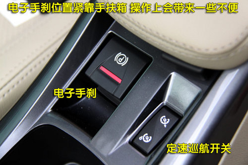 電子手剎的位置位于手扶箱前側(cè),實際操作中按照正常坐姿會感覺到有一些不便,但該功能在使用中比較便利,按鍵阻尼的手感也比較適中,并且電子手剎的配置確實非常實用。在電子手剎旁則是定速巡航系統(tǒng)的開關(guān)鍵,這與前段時間評測的科雷傲相同,同樣在使用中會感到一些不便,我甚至在想,為什么不能把這個功能都整合到方向盤中呢?