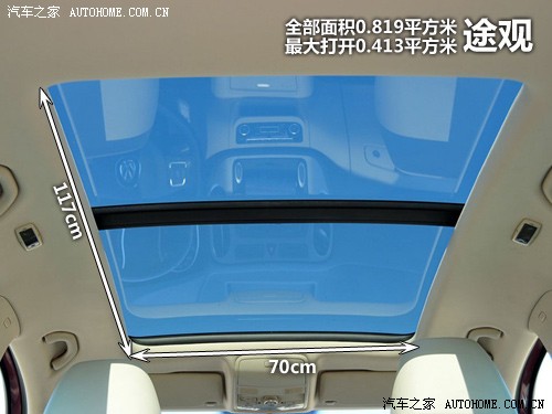 途觀的天窗和大眾以往其他的電動天窗秉承一樣的設(shè)計,一鍵式開啟時,天窗并不能一直打開到底,這個時候打開的長度大概為46cm,再擰一下旋鈕,天窗會繼續(xù)向后打開,此時打開的長度為59cm,全部可打開的面積達到0.413平方米。此外,在打開方式中還有一種換氣模式,跟前面說過的Q5一樣,前天窗會翹起,形成一個開口,用來起到換氣的作用,只是看起來比較窄而已。