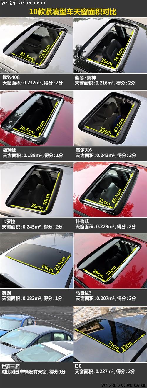 對(duì)于很多購(gòu)買緊湊型車的用戶來說,“天窗”對(duì)他們有很大的吸引力,不僅因?yàn)檫@是一項(xiàng)很顯豪華的配置,天窗對(duì)于車內(nèi)的換氣、車內(nèi)氣氛的營(yíng)造也具有很大的作用,所以我們比一下十款車誰的天窗面積最大,誰的天窗就更有優(yōu)勢(shì)。