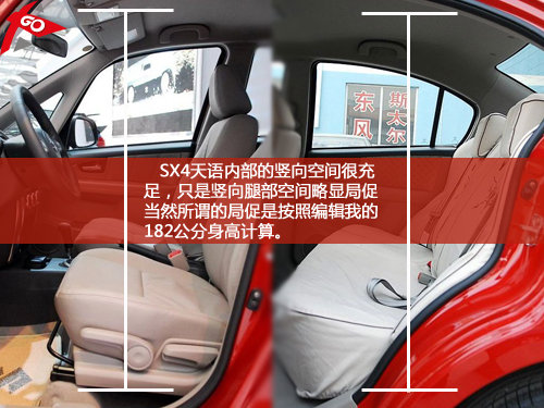 既然是跨界與SUV,那么想當(dāng)然的天語一定會有SUV的一大特點(diǎn),即是相對于轎車更加寬大的車內(nèi)空間,而在天語SX4的內(nèi)部,如果你的身高不高于180cm的話,那么天語完全可以給你很不錯的車內(nèi)空間享受,只是其內(nèi)部乘坐感受硬邦邦的,比如內(nèi)飾材質(zhì)以及座椅與身體接觸的感覺等等,缺少了很多轎車應(yīng)有的乘坐舒適性。
