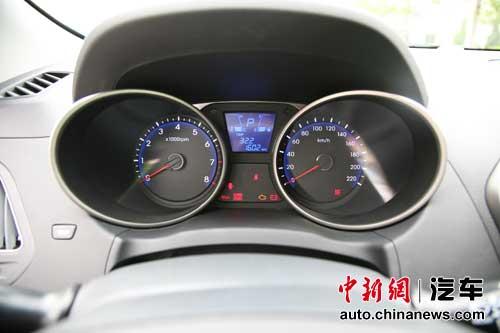 圖注:藍色背光的炮筒型儀表。和老款途勝一樣,ix35的行車電腦依舊不具備平均和瞬時油耗顯示功能。