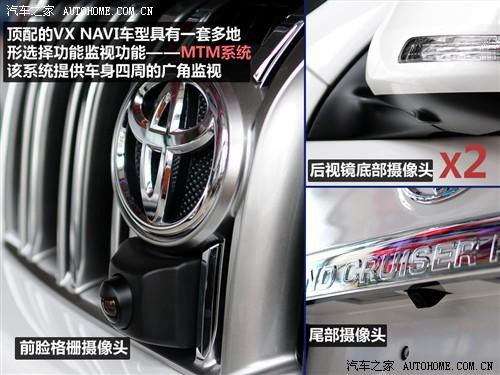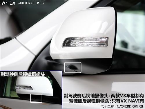 配置上的區(qū)別首先在前臉格柵就能發(fā)現,因為在車標下面隱藏了一個攝像頭,而這在低配車型上是沒有的,與之搭配的是正副駕駛后視鏡下面和車輛尾部也各有一個攝像頭,四個攝像頭組成了VX NAVI車型的“MTM多地形選擇功能監(jiān)視系統(tǒng)”。VX車型則沒有正駕駛后視鏡上的攝像頭。