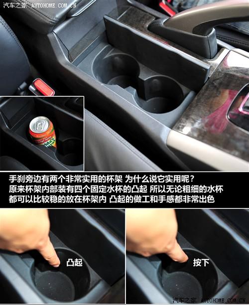 手剎邊上的杯架做工非常不錯,內(nèi)部帶有彈性的卡扣,各種粗細大小的水杯都可以比較穩(wěn)的放在其中。而扶手箱下的儲物盒雖然深度一般,但是內(nèi)部的空調(diào)出風口大大增加了它的實用性,兩個帶有空調(diào)出風口的儲物空間是車內(nèi)絕對的亮點。