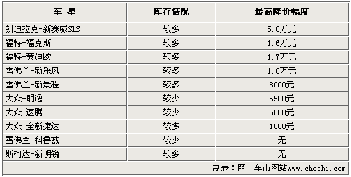 我們選取了目前市場上熱銷的大眾朗逸、福特?怂沟10款車型。經(jīng)過我們在北京市場的調(diào)查后發(fā)現(xiàn),這些車型目前的庫存量較上個月均有所上升,大部分車型的價格開始出現(xiàn)松動,最高降幅達5萬元。而也有部分新上市不久的車型價格仍然堅挺,但是現(xiàn)車明顯增多。