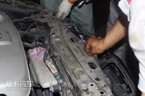 工人師傅們開始動(dòng)手拆掉外部擋板,來徹底查看一下水箱冷凝器,是不是因?yàn)楫愇锖突覊m的堆積導(dǎo)致散熱能力下降,并清理水箱冷凝器外部進(jìn)氣網(wǎng)。