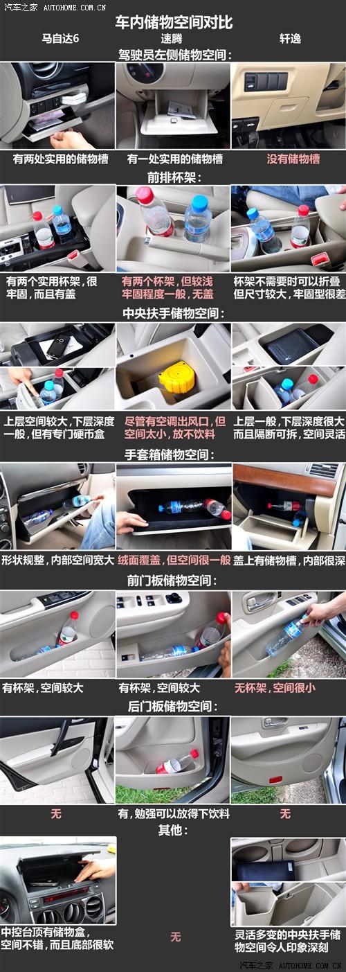 車內(nèi)儲物空間對于車輛實用性的影響也很大,我們對于三款車用相同的道具、按照相同的標(biāo)準(zhǔn)進(jìn)行衡量: