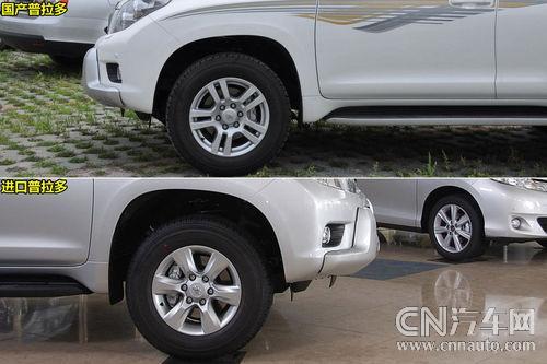 功能配置差異:此外,國產車型增添配置了電動調節(jié)座椅,電動調節(jié)方向柱,座椅加熱功能,智能感應鑰匙一鍵啟動系統(tǒng),電動天窗等等。普通車型音響系統(tǒng)采用6碟CD和9個揚聲器,而兩款NAVI車型則采用了更高的6碟DVD和14揚聲器配置。不同于進口車型的265/65R17輪胎,國產高配VX車型配置更加美觀的18寸五輻條雙叉臂鋁合金輪轂和265/60R18鄧祿普GTANDTREK系列AT22輪胎。