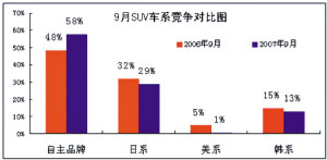 統(tǒng)計(jì)數(shù)據(jù)顯示,今年前9月,自主品牌SUV的市場(chǎng)占有率達(dá)到了58%,比起去年的48%增長(zhǎng)了10%,其中長(zhǎng)城和奇瑞瑞虎的銷量都在4萬(wàn)輛左右,市場(chǎng)份額達(dá)到15%。