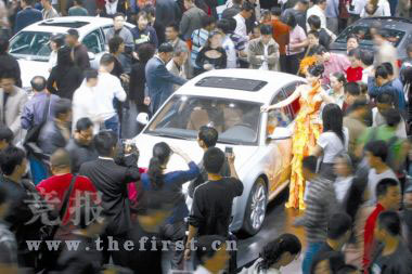 記者到達E4館時,里面人群行動非常緩慢,而且基本上只能在過道中間行走,想靠近展臺幾乎是不可能。不少觀眾抱怨什么都看不到,還有的后悔應該最早來看豪華車。(黃毅)