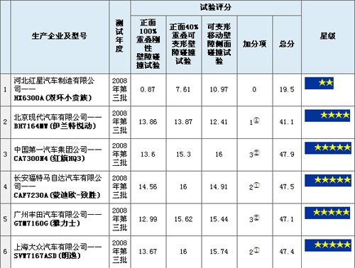 獲得五星級(jí)碰撞成績的車型還有:長安福特馬自達(dá)汽車有限公司生產(chǎn)的蒙迪歐牌CAF7230A型轎車(蒙迪歐致勝)、廣州豐田汽車有限公司生產(chǎn)的豐田牌TOYOTA GTM7160G型轎車(豐田雅力士)、上海大眾汽車有限公司生產(chǎn)的朗逸牌LAVIDA SVW7167ASD型轎車。北京現(xiàn)代汽車有限公司生產(chǎn)的北京現(xiàn)代牌BH7164MW型轎車(悅動(dòng))獲得四星級(jí)成績。河北紅星汽車制造有限公司生產(chǎn)的紅星牌HX6300A型旅行車(雙環(huán)小貴族)僅獲兩星級(jí)成績。
