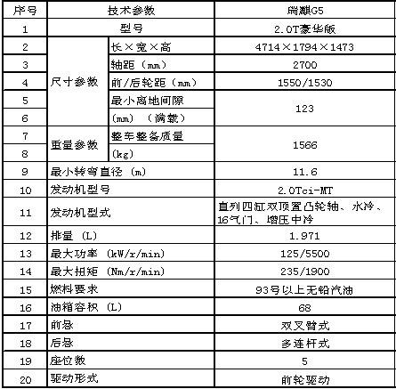 Riich瑞麒G5的長、寬、高分別達(dá)到4714mm、1794mm、1473mm,軸距為2700 mm。瑞麒G5配備2.0T發(fā)動機(jī),是奇瑞正向開發(fā)的2.0渦輪增壓發(fā)動機(jī),最大功率輸出125kW,235N·m的峰值扭矩在1900rpm即可輸出,與其相匹配的是6速手動(6MT)和5速自動(5AT)兩種變速箱。