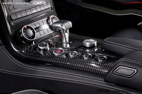看到內(nèi)飾的第一感覺(jué)就是運(yùn)動(dòng)感很強(qiáng),無(wú)論是全黑色的真皮內(nèi)飾,還有鑲嵌點(diǎn)綴在各處的碳纖維面板,或者是三輻、平底的真皮方向盤(pán),像瞄準(zhǔn)鏡一般的空調(diào)出風(fēng)口等等,都毫不客氣的顯露出了SLS以運(yùn)動(dòng)為本的設(shè)計(jì)理念,當(dāng)然,這也是在向前輩300SL致敬。