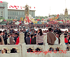 參加50年國(guó)慶游行的大型彩車擺放在天安門廣場(chǎng)上,十月二日數(shù)以萬計(jì)的游人從北京各處涌向這里,一睹節(jié)日廣場(chǎng)的風(fēng)采。