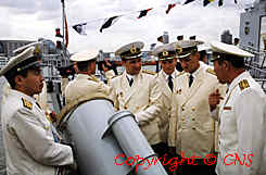 在上海訪問(wèn)的俄羅斯海軍艦艇編隊(duì)官兵,十月四日在中國(guó)海軍揚(yáng)子江碼頭參觀中國(guó)新型的海軍導(dǎo)彈驅(qū)逐艦和護(hù)衛(wèi)艦。