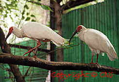 朱(擐右側(cè)加鳥(niǎo))是中國(guó)最瀕危的野生動(dòng)物,全世界僅存二百只左右,堪稱世界珍寶。北京動(dòng)物園從八十年代中期試驗(yàn)人工飼養(yǎng)繁殖,目前已發(fā)展到二十二只。其中十四歲的青青(左)和"丈夫"平平十年來(lái)年年產(chǎn)卵繁殖后代,對(duì)延襲朱(擐右側(cè)加鳥(niǎo))家族貢獻(xiàn)巨大。