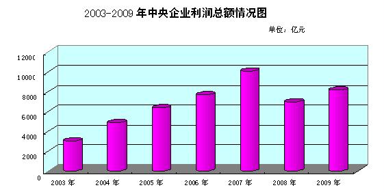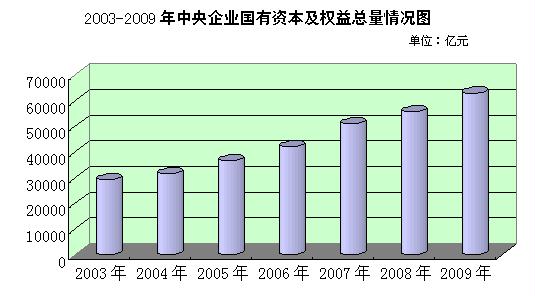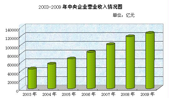 二、經(jīng)營(yíng)規(guī)模情況。截至2009年底,中央企業(yè)資產(chǎn)總額210580.8億元,比上年增長(zhǎng)19.5%;凈資產(chǎn)總額83968.9億元,比上年增長(zhǎng)14.6%。2009年中央企業(yè)實(shí)現(xiàn)營(yíng)業(yè)總收入126271.6億元,比上年增長(zhǎng)6.4%。在全部中央企業(yè)中,2009年底資產(chǎn)總額超過(guò)千億元的企業(yè)有53家,比上年增加8家;2009年實(shí)現(xiàn)營(yíng)業(yè)總收入超過(guò)千億元的企業(yè)有38家,比上年增加5家。在美國(guó)《財(cái)富》雜志2010年公布的世界500強(qiáng)企業(yè)中,上榜的中央企業(yè)有30家,比上年增加6家,比2003年增加24家。