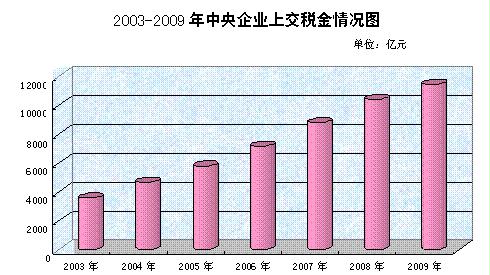 四、上交稅金情況。2009年中央企業(yè)實(shí)際上交稅金總額11474.8億元(含石油特別收益金680億元),比上年增長(zhǎng)10.1%,比2003年增加7911.7億元,六年間年均增加1318.6億元,年均遞增21.5%。在全部上交稅金中,增值稅3782.3億元,占上交稅金總額的33%;企業(yè)所得稅2203.7億元,占19.2%;消費(fèi)稅2071.9億元,占18.1%;營(yíng)業(yè)稅1050.2億元,占9.2%;石油特別收益金680億元,占5.9%。2009年實(shí)際上交稅金總額超過(guò)百億元的中央企業(yè)有23家,比上年增加1家,比2003年增加15家。