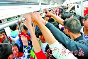 4日的體育西路站,車(chē)廂內(nèi)的乘客擁擠不堪。記者喬軍偉攝